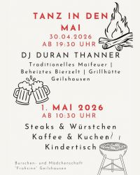 Die Burschen- und Mädchenschaft „Frohsinn“ Geilshausen lädt euch herzlich zur traditionellen Maifeier mit Maifeuer ein.